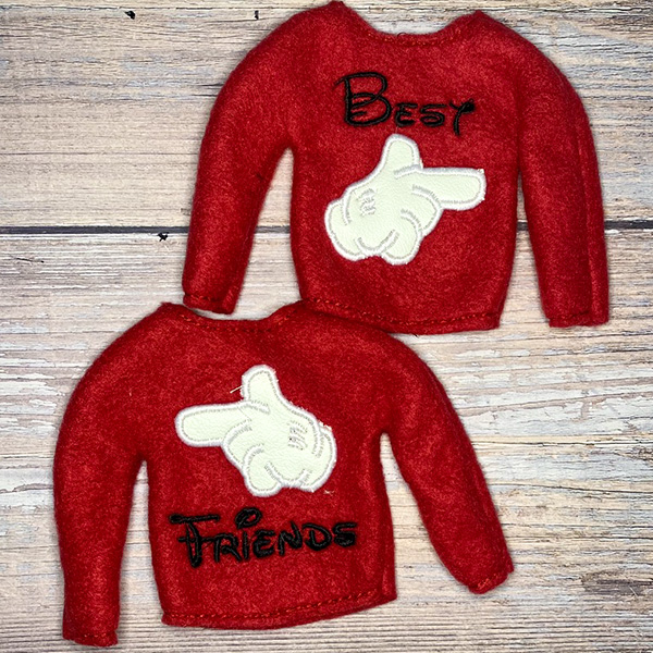 Elf sweater is made to fit the 10″-11″ tall elves with thin arms and legs.  Sweater is made of fleece so it stretches easily to fit your elf.
