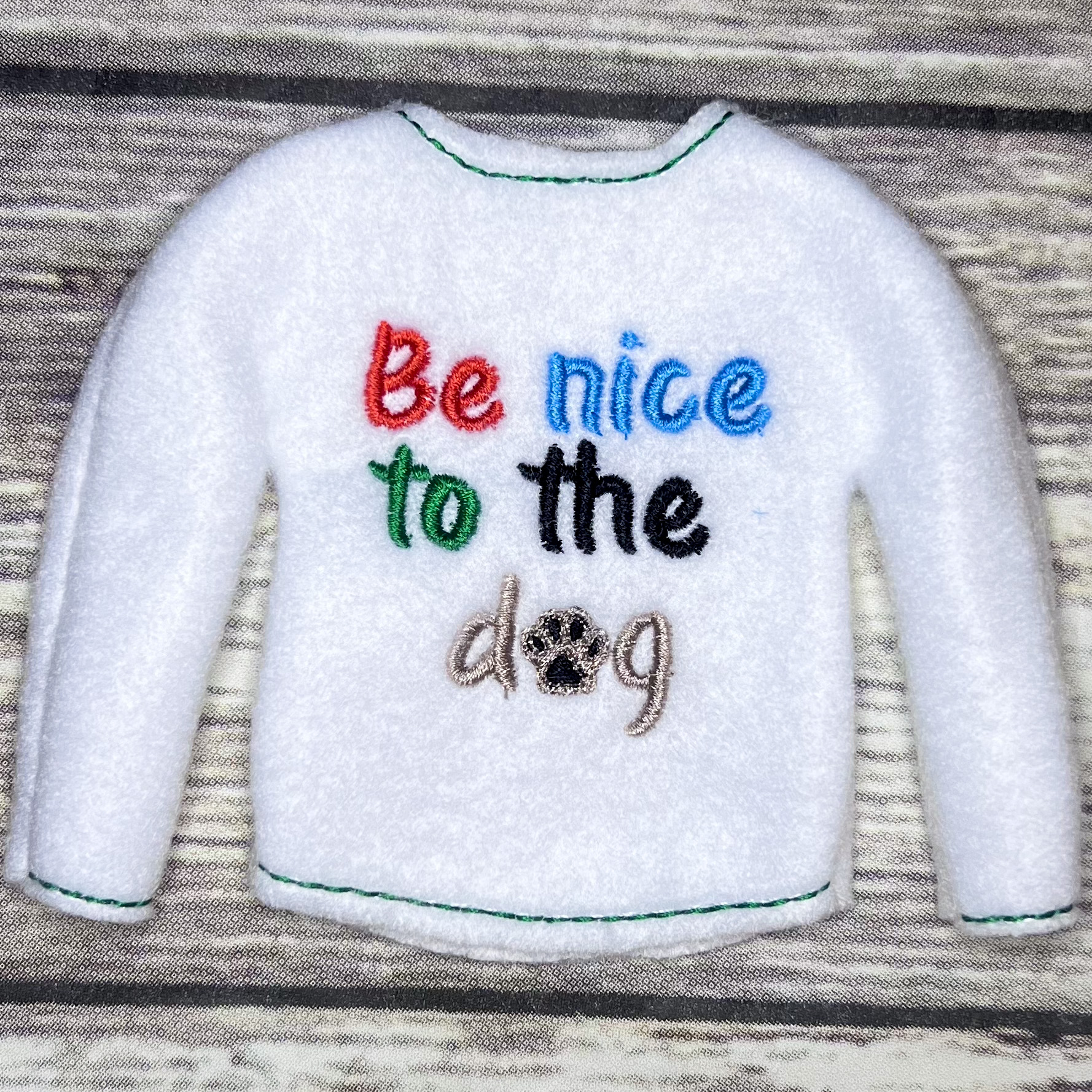 Elf sweater is made to fit the 10″-11″ tall elves with thin arms and legs.  Sweater is made of fleece so it stretches easily to fit your elf.