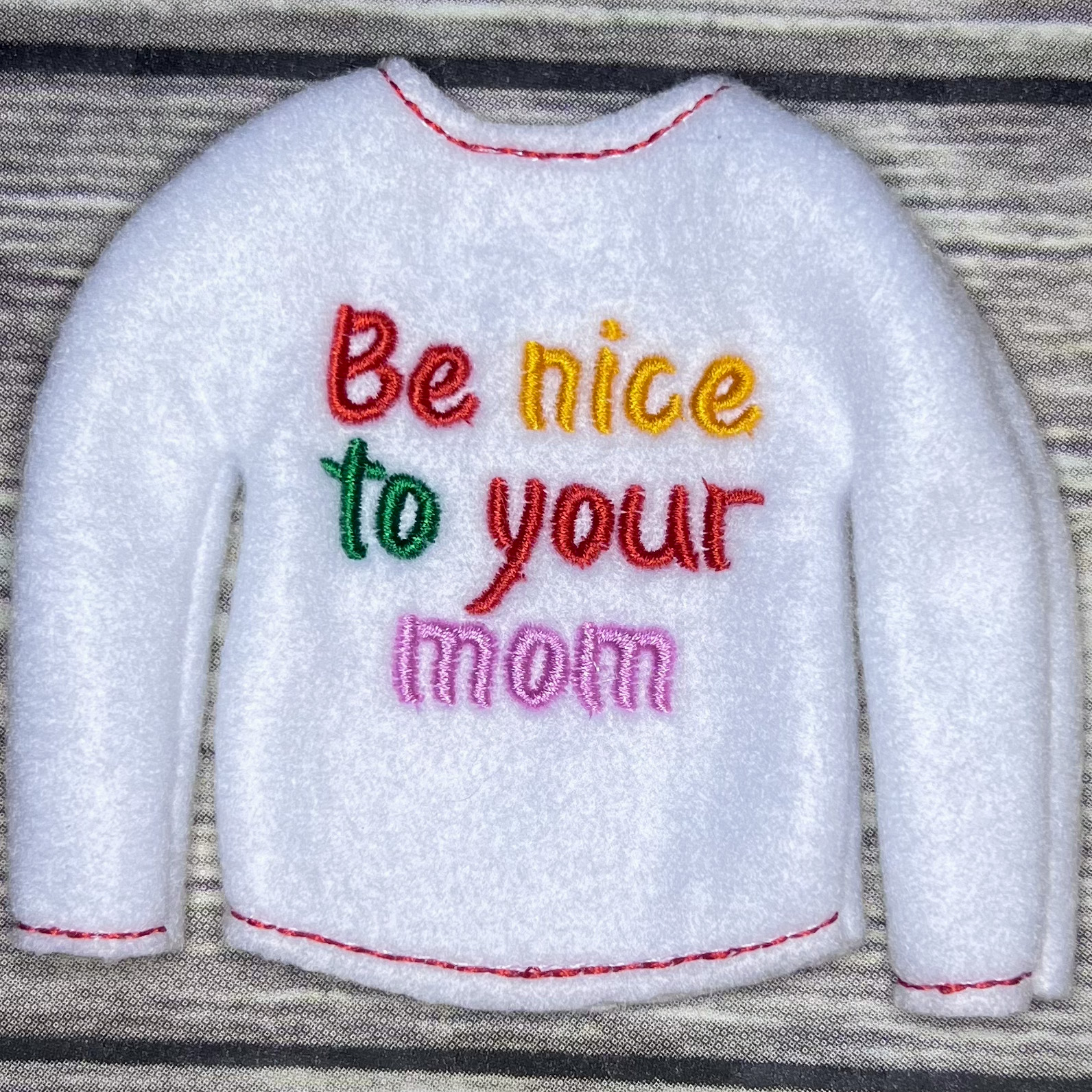 Elf sweater is made to fit the 10″-11″ tall elves with thin arms and legs.  Sweater is made of fleece so it stretches easily to fit your elf.