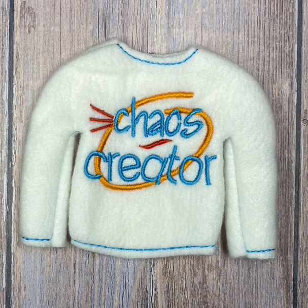 Elf sweater is made to fit the 10″-11″ tall elves with thin arms and legs.  Sweater is made of fleece so it stretches easily to fit your elf.