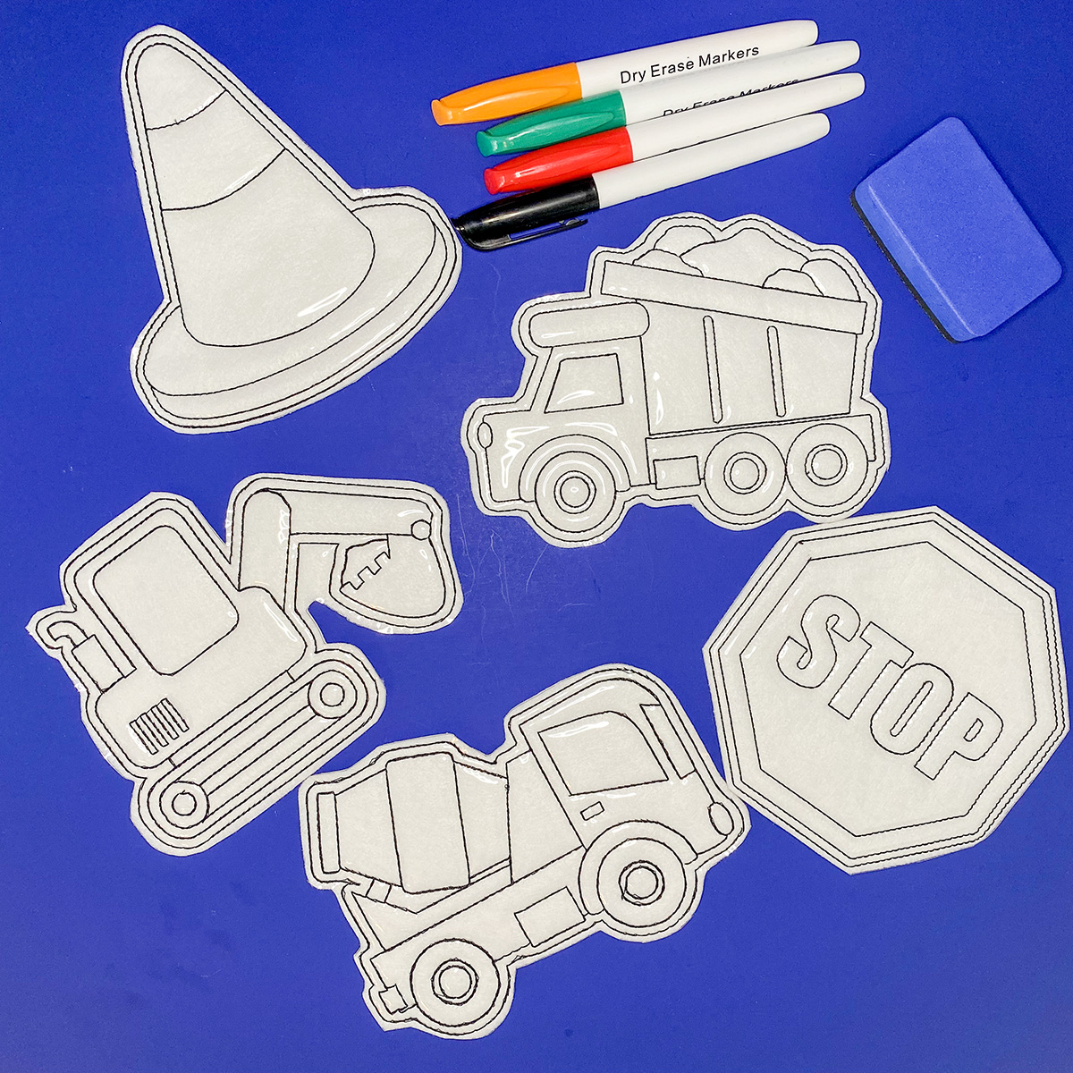 Choose your favorite theme or character. These color kits are made of felt with a clear marine vinyl on top. The kit comes with multiple dry erase markers and a dry marker eraser in a large clear zippered bag. Color, erase and do it all over again. Great for a travel, restaurants, quiet time or on the go fun. For hard to erase marks just use a wet wipe and it will be ready to color again.