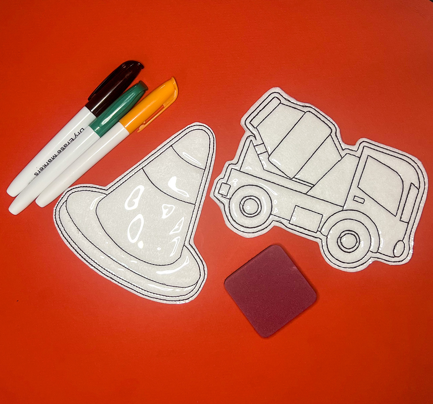 Choose your favorite theme or character. These color kits are made of felt with a clear marine vinyl on top. The kit comes with 3 dry erase markers and a dry marker eraser in a clear zippered bag. Color, erase and do it all over again. Great for a travel, restaurants, quiet time or on the go fun.   For hard to erase marks just use a wet wipe and it will be ready to color again.