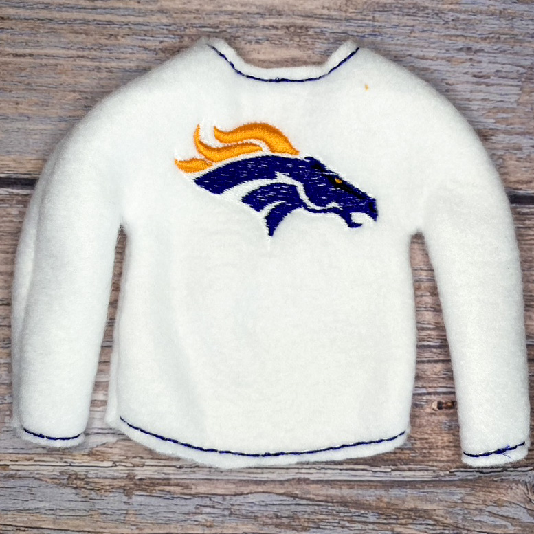 Elf sweater is made to fit the 10″-11″ tall elves with thin arms and legs.  Sweater is made of fleece so it stretches easily to fit your elf.