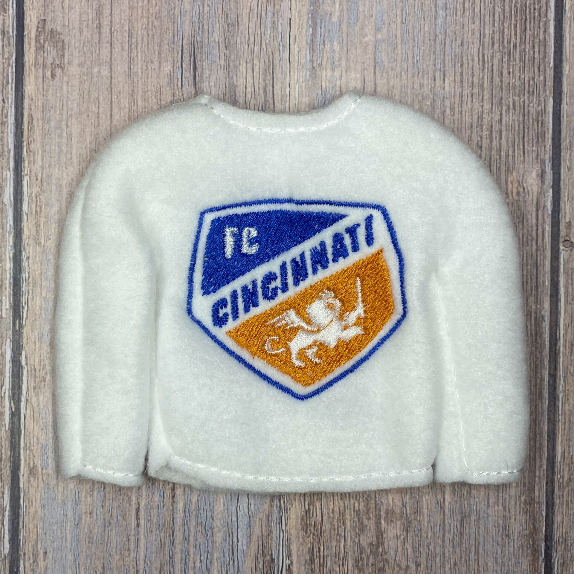 Elf sweater is made to fit the 10″-11″ tall elves with thin arms and legs.  Sweater is made of fleece so it stretches easily to fit your elf.