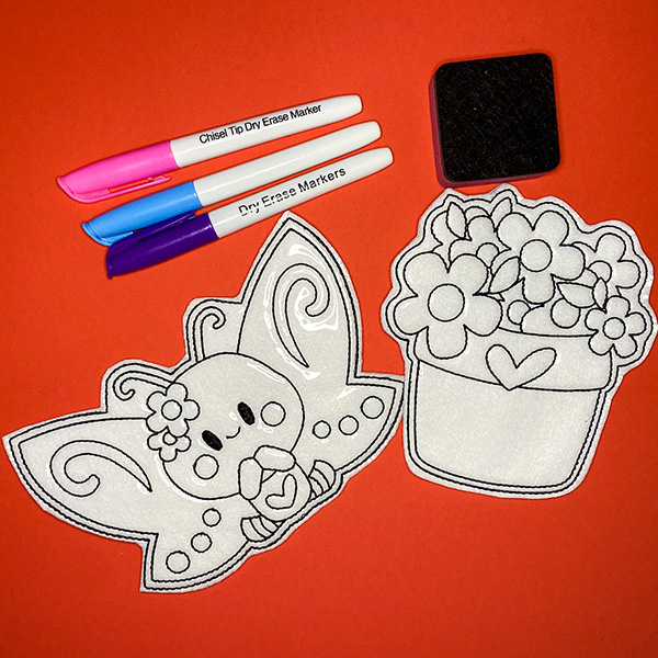 Choose your favorite theme or character. These color kits are made of felt with a clear marine vinyl on top. The kit comes with 3 dry erase markers and a dry marker eraser in a clear zippered bag. Color, erase and do it all over again. Great for a travel, restaurants, quiet time or on the go fun.   For hard to erase marks just use a wet wipe and it will be ready to color again.