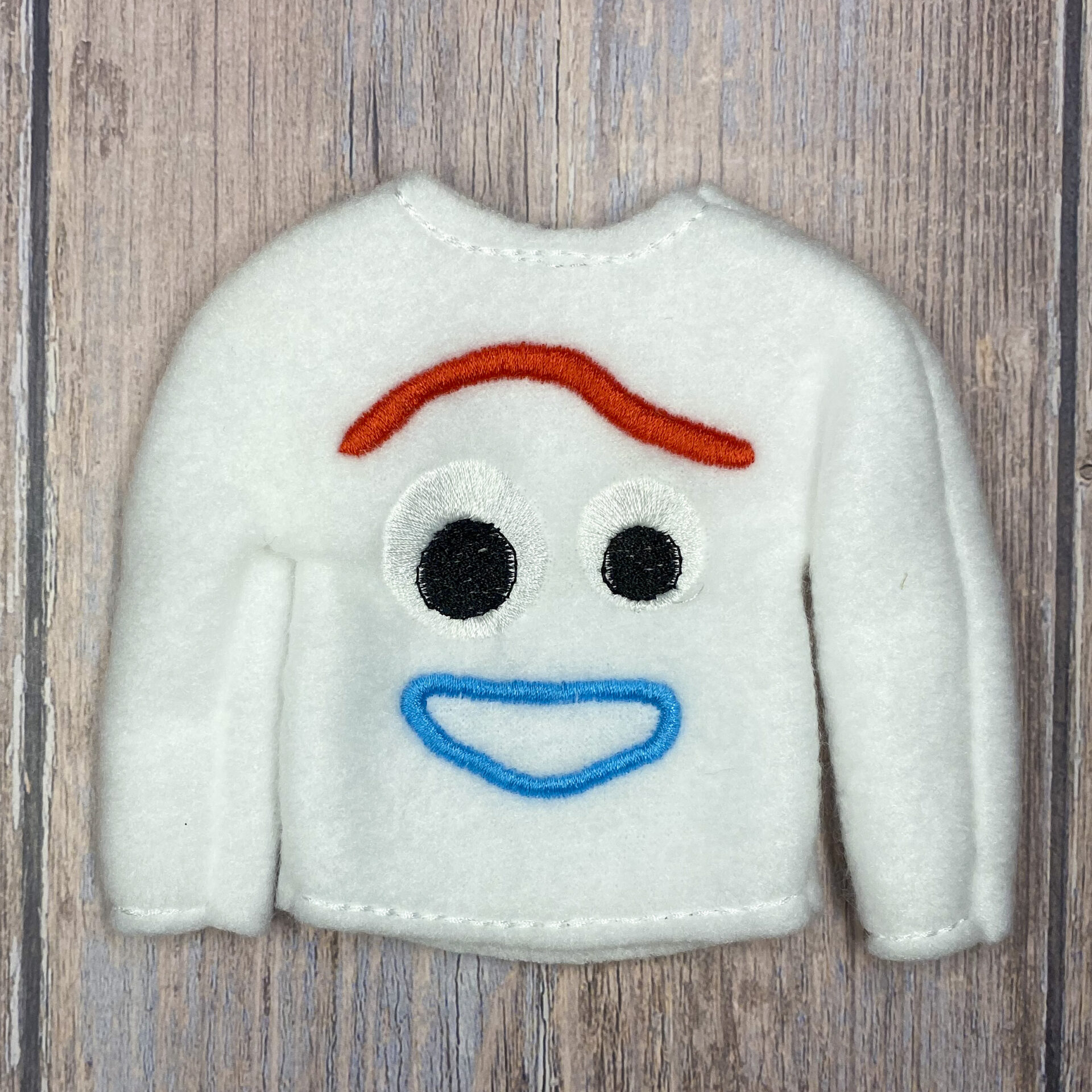 Elf sweater is made to fit the 10″-11″ tall elves with thin arms and legs.  Sweater is made of fleece so it stretches easily to fit your elf.