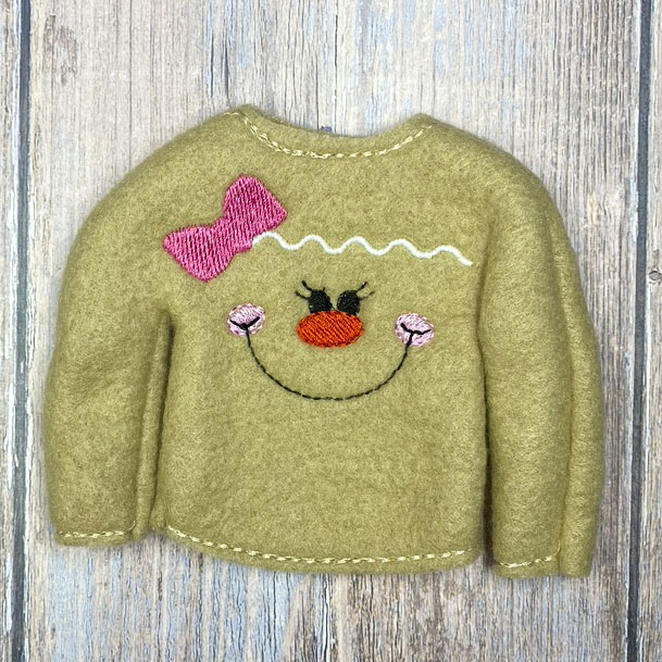Elf sweater is made to fit the 10″-11″ tall elves with thin arms and legs.  Sweater is made of fleece so it stretches easily to fit your elf.