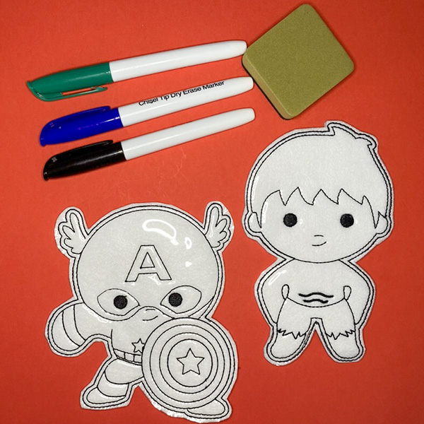 Choose your favorite theme or character. These color kits are made of felt with a clear marine vinyl on top. The kit comes with 3 dry erase markers and a dry marker eraser in a clear zippered bag. Color, erase and do it all over again. Great for a travel, restaurants, quiet time or on the go fun.   For hard to erase marks just use a wet wipe and it will be ready to color again.