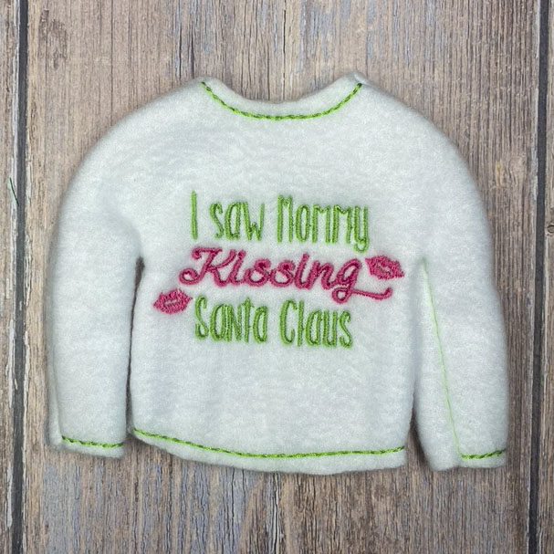 Elf sweater is made to fit the 10″-11″ tall elves with thin arms and legs.  Sweater is made of fleece so it stretches easily to fit your elf.