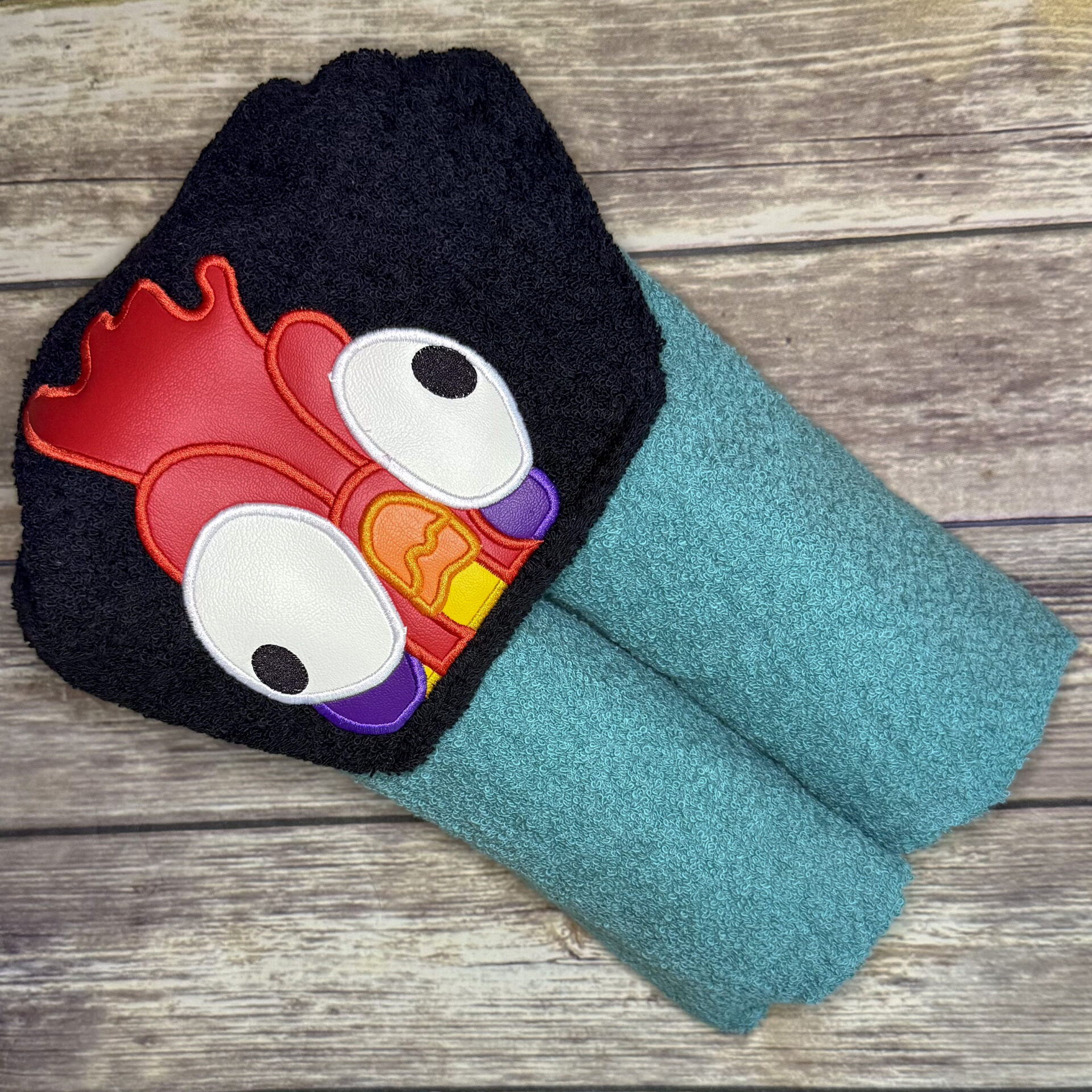 Made from full size towels (approximately 54″ x 30″) with color coordinated hoods. The embroidery is mainly marine vinyl or some fleece. They make great birthday or holiday gifts.