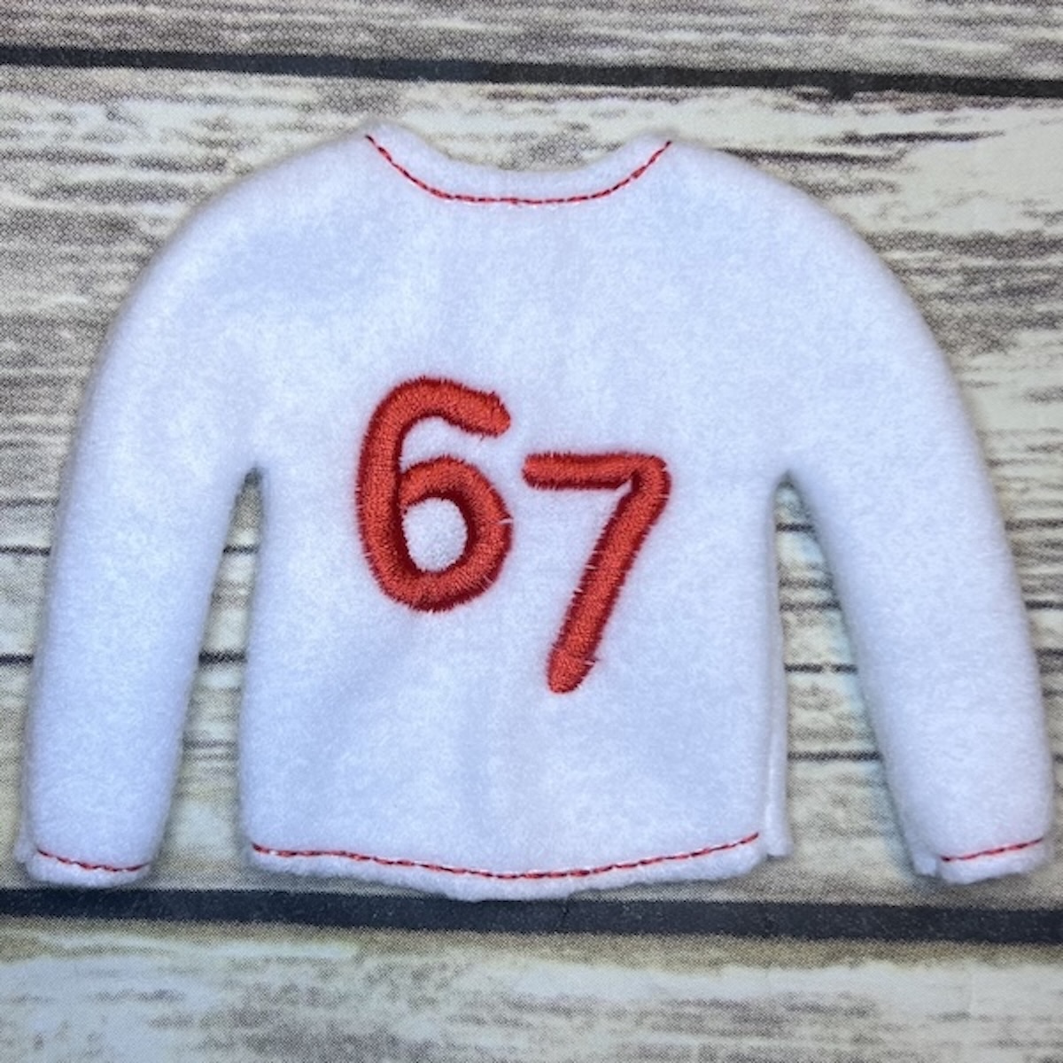 Elf sweater is made to fit the 10″-11″ tall elves with thin arms and legs.  Sweater is made of fleece so it stretches easily to fit your elf.