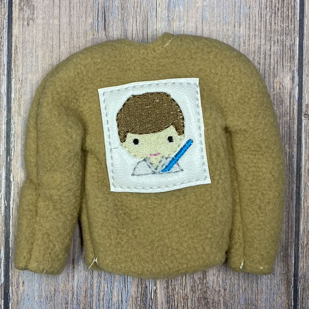 Elf sweater is made to fit the 10″-11″ tall elves with thin arms and legs.  Sweater is made of fleece so it stretches easily to fit your elf.