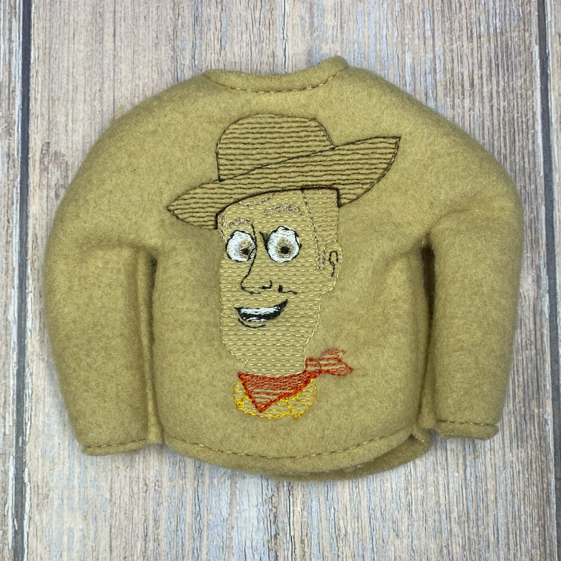 Elf sweater is made to fit the 10″-11″ tall elves with thin arms and legs.  Sweater is made of fleece so it stretches easily to fit your elf.